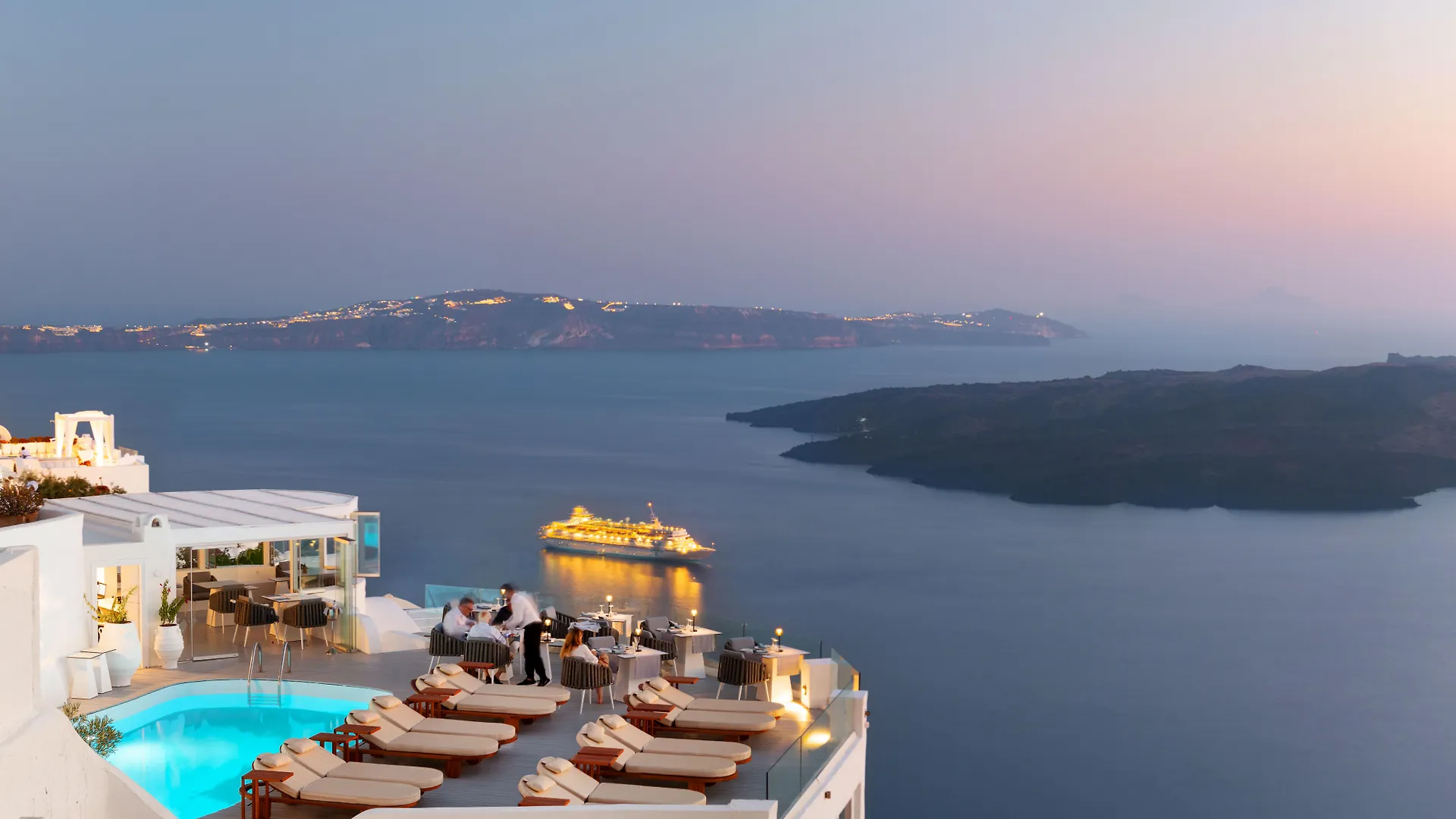 The submerged Santorini caldera Volcanic Crater is less than 4.2 km away. The hotel places you at a distance of 30 metres from Aegean Sea.